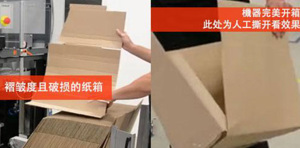 (1)高开箱率:开箱采用90°主动成型,速度快且稳;即使纸箱有欠缺褶皱都能成功开箱,不卡机;