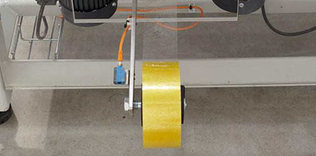 胶带设有电眼感应,物料用完即刻发出报警声,胶带盘外置的设计便于人员更换胶带,当速度低于12箱时可不停机换胶带。