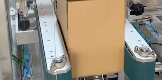 通过凸轮运动纸箱90°成型,吸盘自动吸取纸箱,自动水平折底 -- 自动封底一步完成。